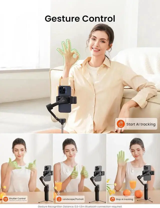 Phone: The mobile phone stabilizer is compatible with the iOS/ Android phone system, supporting all smartphones with a width of 5898mm and a thickness of 12.5 mm. The gimbal itself can Pan for 330°, Roll for 330°, Tilt for 80°- AI Tracking Sensor with