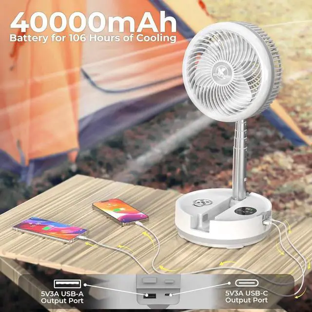 Long-lasting Battery & Emergency Power: With a 40000mAh battery, this foldable battery fan offers up to 106 hours of cooling on the lowest speed. Dual 5V3A USB-A/C output ports can charge your phone during hurricane power outages or on outdoor trips