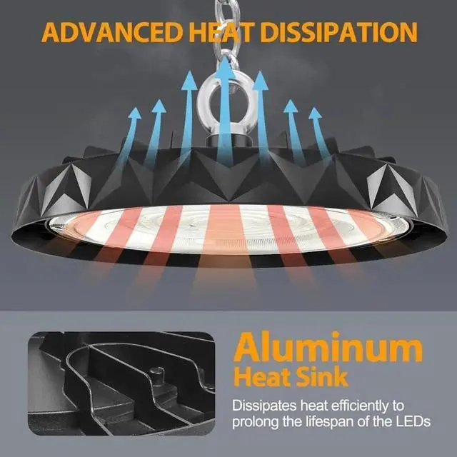DURABLE DESIGN: UFO-style housing with geometric heat sink pattern maximizes cooling efcien and extends operational lifespan