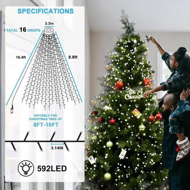 Specications: 592 LED warm white lights, 16 9.8 ft string lights, 37 lights per string lightslead length 16.4 ft. The tree lights is suitable for 8ft-10ft Christmas tree (It also can be used for smaller Christmas trees, but the light strip will be longer, fold it and place it on the Christmas tree)