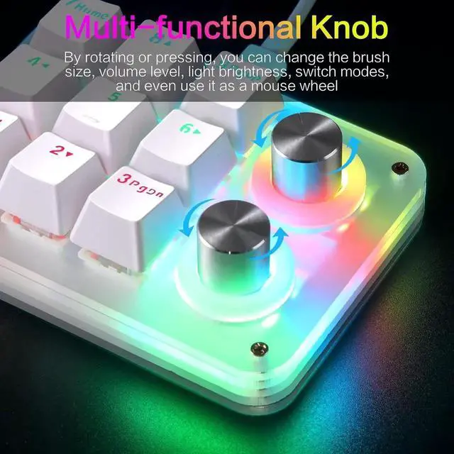 One Handed Mini KeyboardNice quality. Small and portable mini keyboard with unique knob is perfect for making work faster, plays games smoothly etc. The knob (rotate left and right, press down) also can be programmed. Rotate left and right can be infinitely rotated, can be set to ± volume, switch music previous/next, decrease/increase light brightness, switch light mode, turn pages forward/backward etc. you can carry it with you, effectively saving desktop space.
