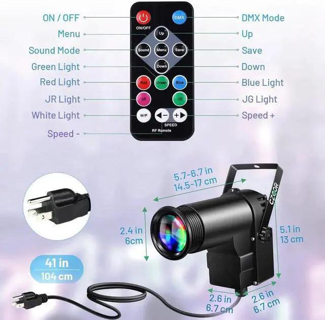 - Spotlight with 2 Control Mode: Remote Control / DMX 512, Remote Control RGBW Color selection and Sound Activated; DMX 512 Control RGBW Color Sound Activated RGBW mixed color, strobe and dimming. Simply rotate the lens and adjust the installation distance to customize the spot size.