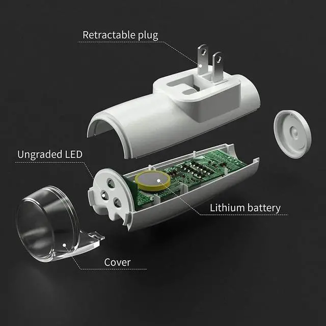 Our design team applied a retractanle plug/prongs system to the base's power prongs, allowing the nightlight to fit into virtually any standard outlet in the house. This adds the finishing touch to a simple design that affords you much peace of mind. Simply plug in and peace out.