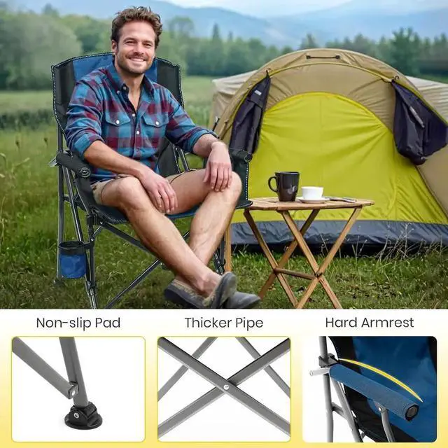 Portable Hard Arm Folding Camping ChairWhether you're camping, boating, hiking, hunting, fishing, sporting events or traveling, getting a great rest is vital to any trip! Our portable camping chairs aim to provide you a cozy environment to relax. A steel frame with hard armrest and padded polyester make for a special comfort and durability even in the wild, while the wide feet keep the chair stable. Bring a chair with your travel, which makes your travel colorful.