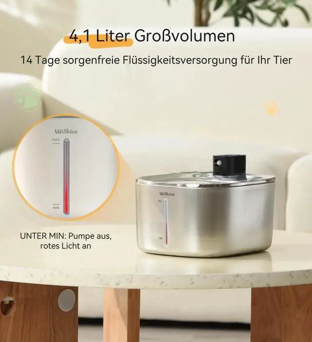 - 138fl oz/ 4.1L Large Capacity: This extra-large 138oz ( 4.1L ) stainless steel cat fountain holds enough fresh water for 2 cats for over 15+ days. Great for multiple pet households. Hassle-free use and low-water indicator light tells you when to refill