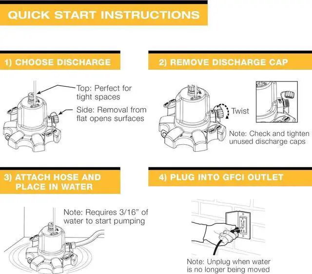 Please note: the pump should be unplugged once the water is gone or pump will run dry.