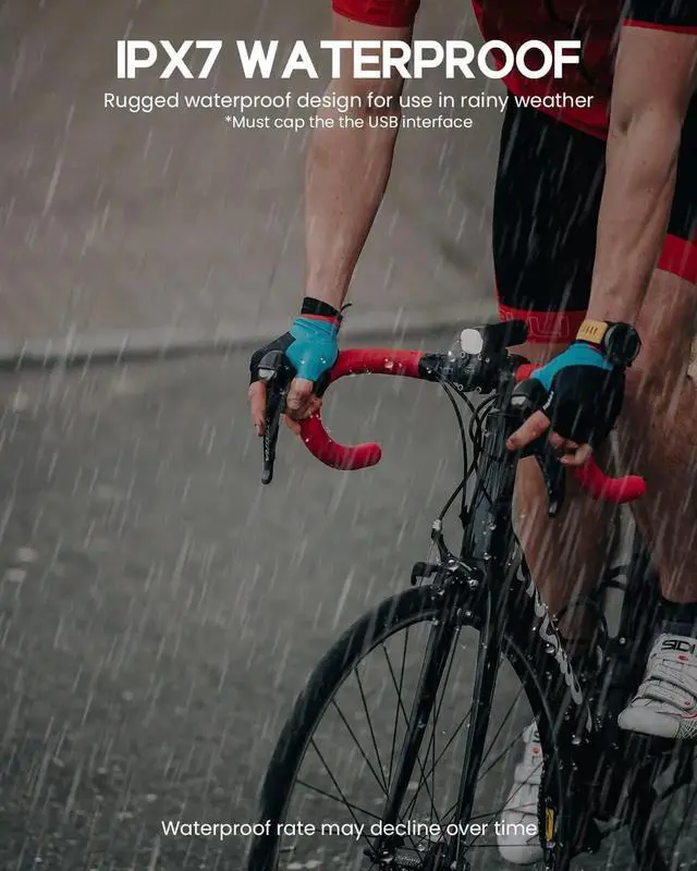 Front Bike Light with USB-C Rechargeable High Capacity BatteryRuntime range sfrom 1.5 hours to 7 hours depending on light mode. Charging time under 5V 3A is 2.5 hours. This light will act as a mobile power bank for your USB-C compatible mobile devices. Supports up to 15W fast charging 5V/3AfalseIPX7 Waterproof Bike Light All integrated design, one piece alloy casing, and fine craftsmanship make the RN 1200 a very durable and waterproof bike headlight. IPX7 rating allows full function during mid to heavy downpours. Exterior casing processed for enhanced resistence to abrasion and corrosion.