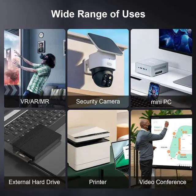 Wide CompatibilityThe USB-A to right angle USB-C cable supports up to 10Gbps bandwidth transmission speed, only data transmission, plug and play, backward compatible with USB 3.0 / 2.0 / 1.1. Compatible with VR, Oculus Quest 2, laptops, VR glasses, Xbox, webcam, Logitech camera, laptop, USB touch screen, vaddio cameras, mini pc, aver webcam, Kinect, RealSense, printer, scanner, flash drives, as well as for professional applications like HD business video meetings and video surveillance.