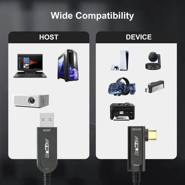 Fiber Optic USB 3.2 CableGEOHNG 10Gbps USB A to C active optical cable (AOC) uses optical fiber instead of copper as the high-speed signal transmission medium, without any signal loss/stuttering/black screen. Compared with traditional copper cable, it is softer, faster, lighter, and has perfect EMI/EMC technology.