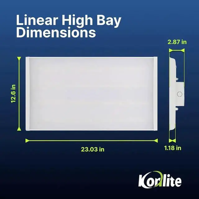 Feel at ease knowing reliable assistance can be readily accessed regarding any shop lighting concerns. - Confidently Illuminate Your Space - Experience exceptional brightness with Konlite's LH02 Seires 2 FT 165W LED shop light, offering 22, 400 lumens with high efficacy of 135lm/w. Enhance productivity and safety in your workspace with these LED high bay lights, tailored to commercial or industrial settings. The dimensions of the light are 23.03"L x 12.6"W x 2.87"H.