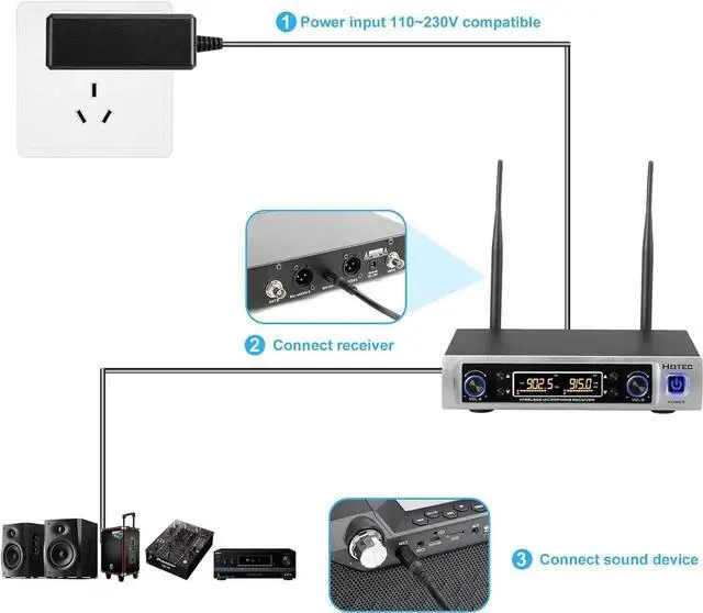 FULL COMPATIBILITY: Connect this Hotec UHF Wireless Microphone Receiver to the 6.35 mm (1/4") mic input of any of your sound system like PA, mixers, speakers, amplifiers and karaoke machines, your vocal sound is transmitted to the sound system wirelessly. The receiver has Two XLR individual outputs and one 1/4"/ 6.35 mm mixed output.