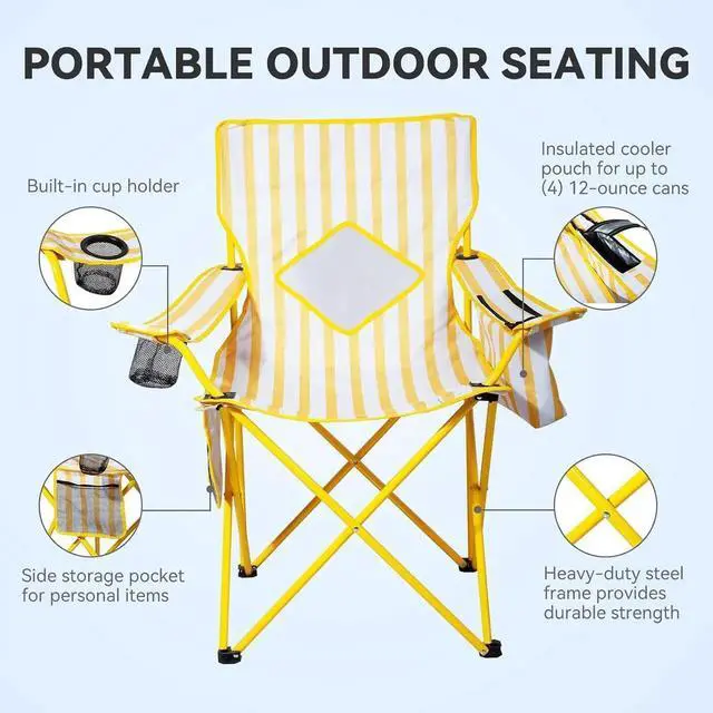 Introducing the Camping Chair - the ultimate camping chair that combines comfort, convenience, and style. This folding camping chair with a cooler pouch is perfect for outdoor enthusiasts who want to enjoy refreshing drinks on-the-go. With a built-in 4 can cooler pouch, you can keep your favorite beverages cold and within reach while you relax in the chair. The fully cushioned seat and back provide ultimate support and comfort, even during long hours of sitting. The convenient mesh cup holder and side pocket allow you to keep your personal items within easy reach, making it the perfect chair for camping, tailgating, beach trips, and sports events. The collapsible and folding design with included carry bag makes it effortless to store and transport, so you can take it with you wherever you go. Whether you're sitting by the fire, watching a game, or enjoying a picnic in the park, the Naura Chair is the perfect companion for all your outdoor adventures.
