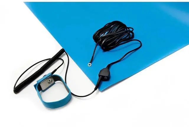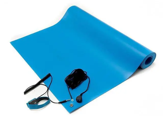 ESD Anti-Static Table Mat Kits are made and assembled in the USA and made of a blue single layer homogenous polymer mix of durable polyvinyl chloride with ESD Anti-Static properties. They are designed to provide a static safe work surface for static sensitive products. These ESD Table Work Surface Mats are low cost, durable, easy to cut, and are reversible. The suggested service temperature is -20 Degrees to 160 Degrees Fahrenheit. These ESD Anti-Static Table Mat Kits are resistant to degradation by inorganic acids, organic acids, reducing agents, detergent solutions, alcohols, aliphatic hydrocarbons, mineral oil, amines, and aldehydes. Comes with an ESD Anti-Static Wrist Strap and ESD Anti-Static Ground Cord. Mat already has a snap and is ready to be used out of the box with minimal assembly.