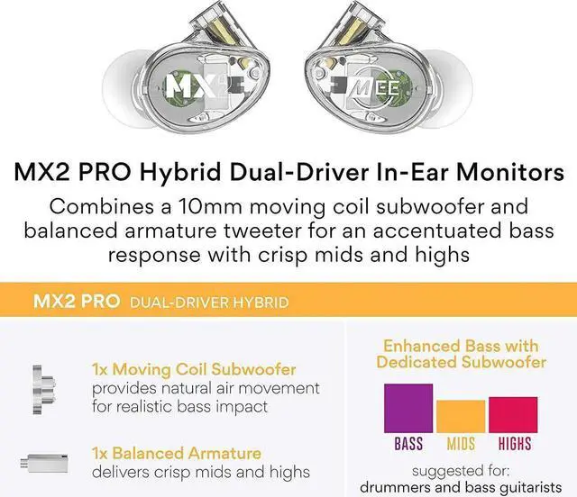 DUAL-DRIVER HYBRID IEM: The MX2 PRO combines a 10mm moving coil subwoofer and balanced armature tweeter for an accentuated bass response with crisp mids and highs, ideal for anyone seeking a solid, extended bass response while maintaining good clarity in the mix.
