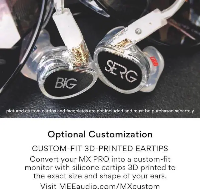 - OPTIONAL CUSTOMIZATION: Convert your MX2 PRO into a custom monitor any time by ordering MEE Professional custom-fit eartips, 3D-printed to the exact size and shape of your ears for a perfect fit and improved noise isolation; then, personalize your earphones with engraved metal faceplates choose from existing artwork options or use your own design