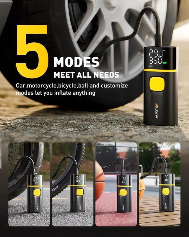 4+N INFLATION MODESThe tire inflator is designed to meet all your inflation needs with 4+N versatile inflating modes. It includes 4 preset modes for convenient inflation of cars, bicycles, motorcycles, and balls, making it suitable for a variety of uses. Additionally, the manual mode allows for customizable inflation up to 150 PSI, perfect for tailored setups based on specific requirements
