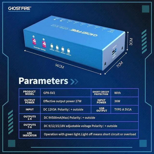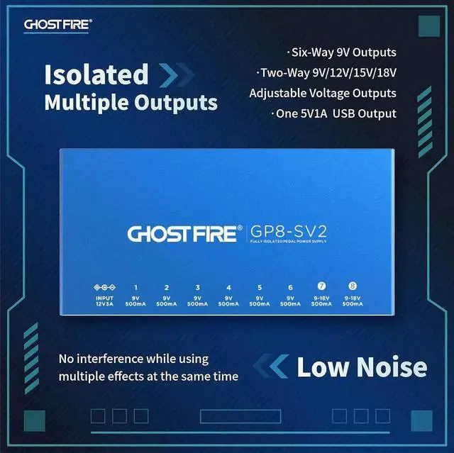 falseWith Short Circuit SafeguardThe product model is GP8-SV2 eight way single power supply with short circuit protection. The effective output power is 27w. The input is DC-12V3A with internal negative external positive, the input power is 36w, and the USB output is TYPE-A 5V1A. The maximum output DC of 1-6 circuits is 9v500mA per circuit, the adjustable voltage of 7-8 circuits is 9/12/15/18v, and the maximum power is 4.5 wfalse- 8-Channel Fully IsolatedGHOST FIRE eight way guitar pedal power supply, with fully isolated multi-channel power supply: it has six 9v outputs, two 9v/12v/15v/18v adjustable voltages, and one 5v1A USB output, giving you a variety of choices.