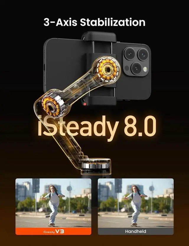 Creative: The Hohem V3 phone gimbal can payload up to 300g. iSteady 8.0 3-axis stabilization can capture images clearer and smoother with less shaking and blurring. You can customize your composition with gesture control, and 4 different gimbal working modes and a joystick make shooting more enjoyableCompact Design with