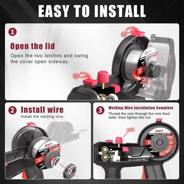 Handheld MIG Welding Kits1* Handheld MIG Welding Machine, 1* 0.03" /1lb Flux Cored Wire, Contact Tip. 030"×1+. 035"×1, Nozzle×1,. 030" K Groove Drive Roller×1 (on the machine),. 035" K Groove Drive Roller×1, Ground Cla×1 (on the machine), Brush & Hammer×1, User Manual×1.