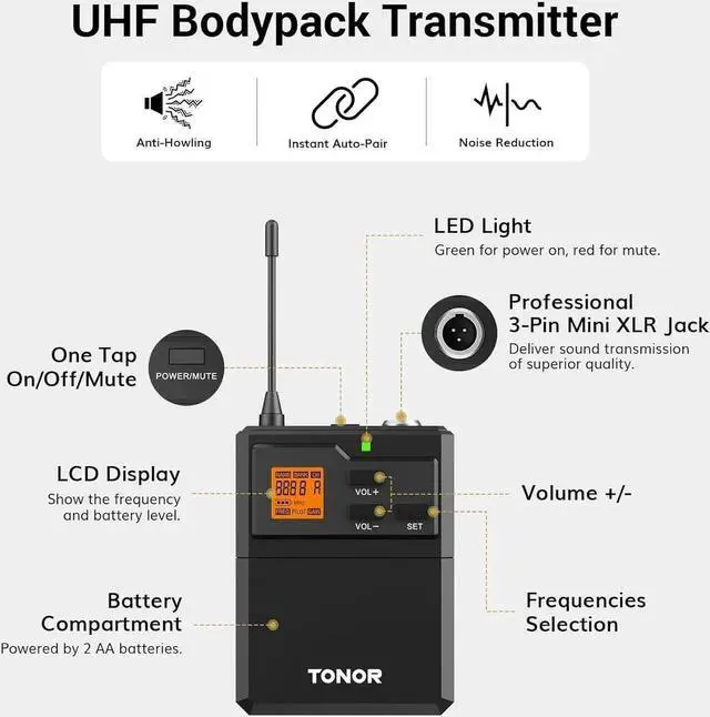 - Robust Materials: The high-quality ABS casing is specially designed to be resistant to impact and corrosion. The bodypack transmitter features an independent volume control button and a one-touch mute function to prevent audio interference.
