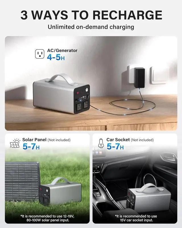 [Three charging methods]-: It can be charged through AC adapter, solar power panel (not included) and car cigarette lighter (not included). It only needs to be charged for 5-7 hours, and you can travel with peace of mind.