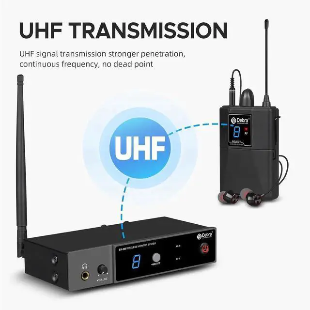 Devoted ServiceGenuine D Debra Pro audio products come with 12-month manufacturer assurance and supportive customer service. Welcome to come to us for troubleshooting or replacement of discontinuous/defective parts. - Comply With FCC Rules501Mhz-599 Mhz, You can rest assured to use it in any occasion. Broadcasts on 16 channels no-interference, Less than 4.5 ms Latency (normal), Up to 107 dB signal-to-noise ratio provides clear, detailed audio at any volume. High Resolution 24-bit/48kbps audio. Broad 20Hz-20KHz frequency response, Dynamic Rang 107 dB.