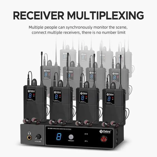 Extensible Unlimited Receivers With one transmitter, no matter how many receivers are added, the receiver and transmitter can work properly as long as they have the same frequency. According to your needs, you can configure different numbers of receivers for various sound monitoring activities, stage performances, studio recordings, exhibitions, lectures, teaching, speeches, etc. The package also includes a standard rack unit that can be used for professional events such as stages. You Would GetUHF wireless IEM transmitter, bodypack receiver, in-ear earbuds, power adapter, antenna, Audio cable, metal Rack Mount, user manual.