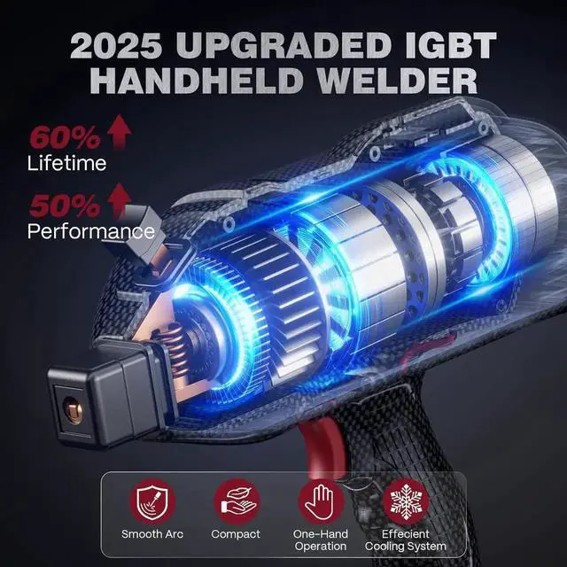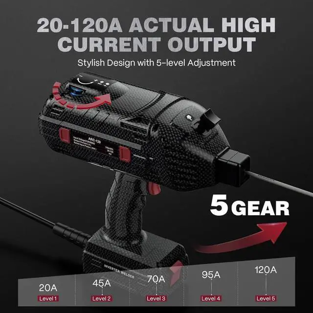 Intelligent Current Control: hand held welder offers an adjustae output of 20-120 as, equipped with an intuitive 5-level knob for precise current regulation. This portae welder handheld adopts a unique carbon fiber printing dgn, integrating practicality and aesthetics. The hand held welder gun is widely applicae to scenarios such as home DIY, auto repair, fence installation, ironwork processing, and regular metal repair.