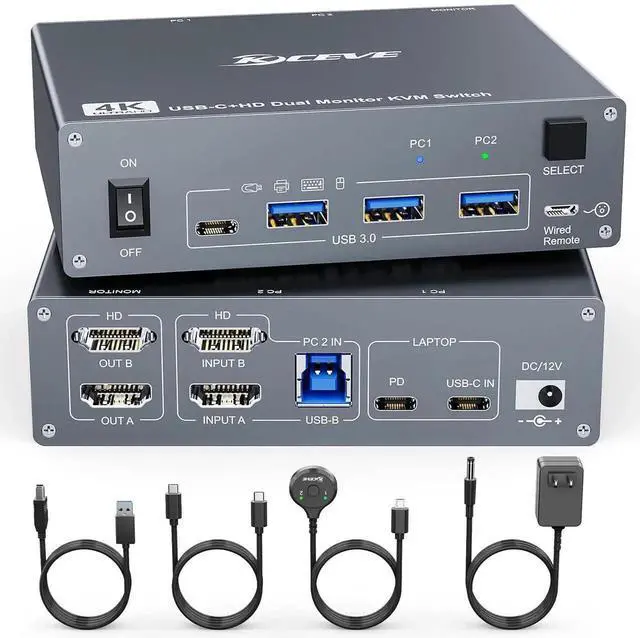 Support 2 Switching ModeThis Type-C USB-C 2 monitors 2 computers KVM switch support physical button and wired control. The wired control is upgraded, it's size is bigger and touch feel is more comfortable. By using the wired control you can hide the dual monitor KVM laptop and desktop under the table and keep the desk tidy.