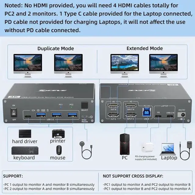 Support 60W PD Fast ChargingDesigned with PD charging port to give enough power for your laptop during using. This is a very stable 2 monitors USB C KVM switch. KVM switch laptop desktop supports the follow resolutions, 4k@60Hz, 2560x1440@/120hz/60hz, 1920x1440@144hz/120hz/60hz, etc. Real test support 60W charging, but some product page stress it support 100w is not the real data.
