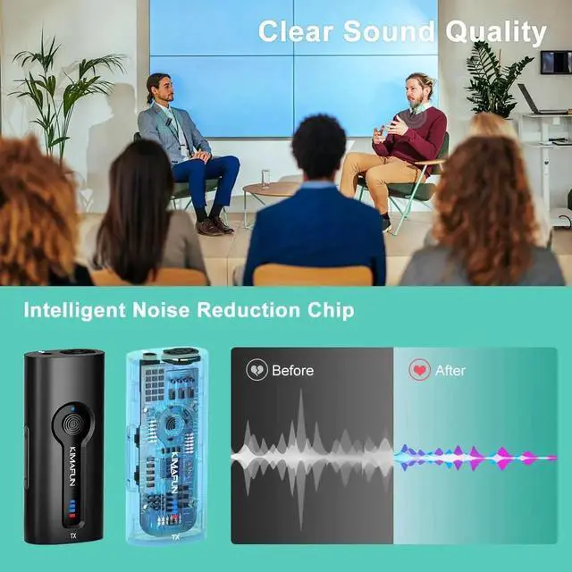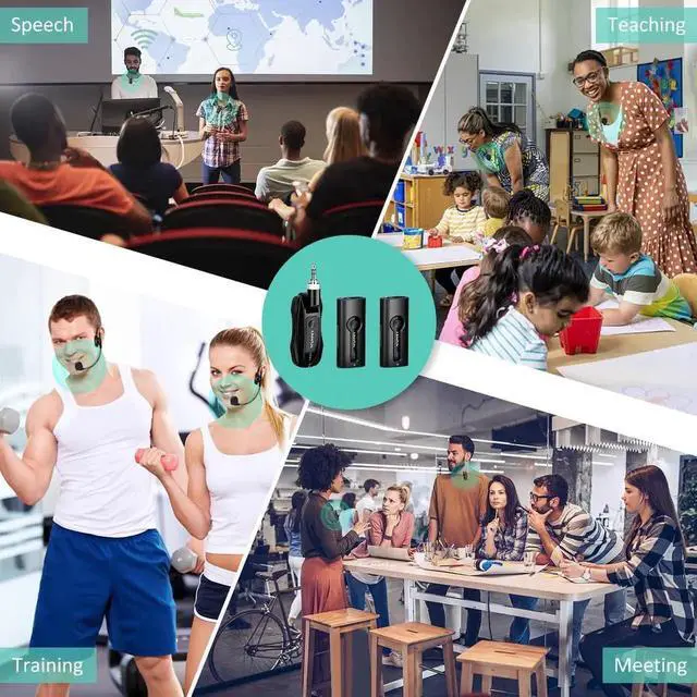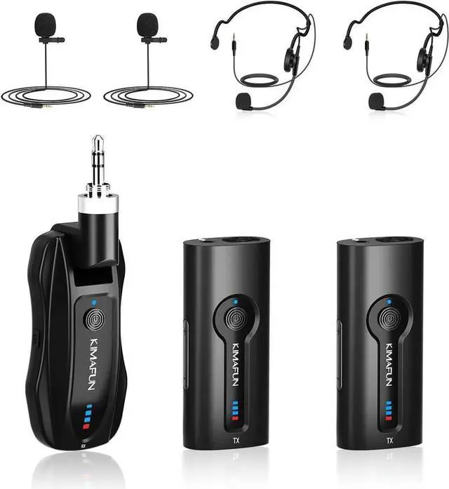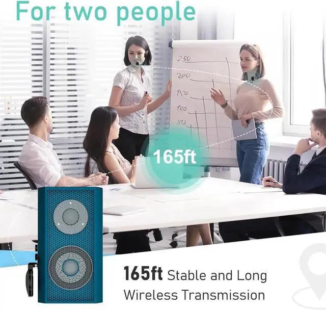 For Two People Sound Pick-up Use this 2 pack microphone system to have two people's voices played over the same speaker simultaneously. Two transmitters can be paired with one receiver. One transmitter can also be paired with one receiver only. It is ideal for teaching, training, classroom, wedding, interview and etc.falseHeadset & Lavalier Microphone It comes with two external headset microphones and two lavalier microphones in the package. There are three ways to use this product. 1. Attach the transmitter to the collar directly. 2. Connect the external headset microphone to the transmitter and use it as a headset microphone. 3. Connect the external lavalier microphone to the transmitter.falsePlug and PlayLong press the power switch to automatically match, and plug the receiver into the speaker to use it. No need for Bluetooth. The maximum wireless transmission distance within the line of sight range is 165ft(50m).false