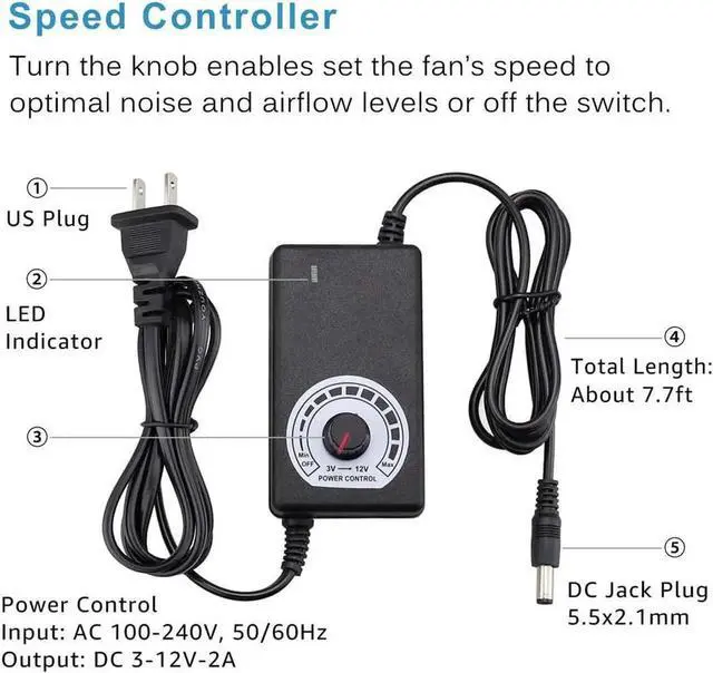 - The power adapter increases maximum fan speed and enables the fan to be powered through an AC outlet.
