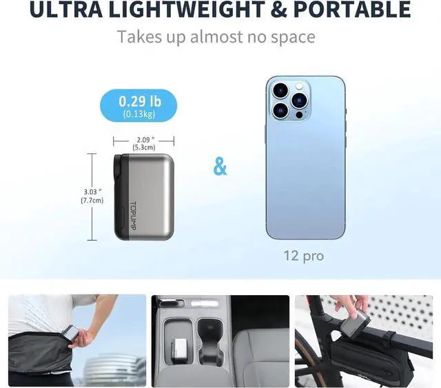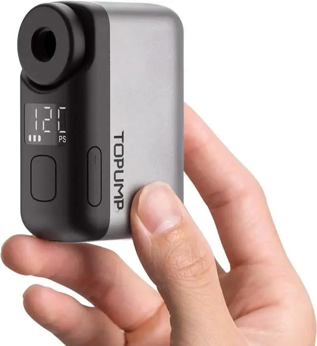 Size: 2.09 x 1.26 x 3.03 inches. Super compact and takes up little space. One-button operation, simple and easy to use. TOPUMP mini bike pump can inflate or patch road tires anywhere, anytime.