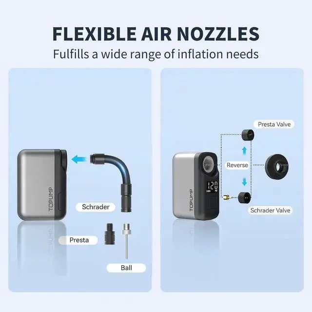 DURABLE & FAST CHARGINGUsing a Type-C USB charging cable, this mini electric bike pump charges fully in just 30 minutes. Once charged, it can inflate at least three 700*25C tires from 0 to 120 PSI. false2 INFLATION METHODSSupports both Presta and Schrader valves for direct inflation. The included air hose + Presta valve converter makes the inflation process easier, completely freeing your hands and saving time and effort. false- DIGITAL PRESSURE GAUGE & AUTO STOPEquipped with a high-definition LED display and pressure gauge, our mini bike tire pump can easily read preset and real-time pressures (MAX 120PSI).