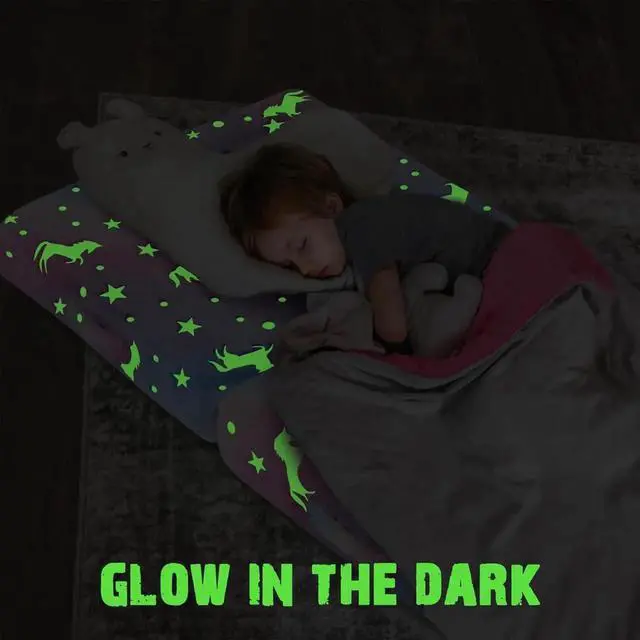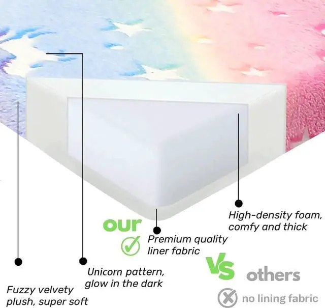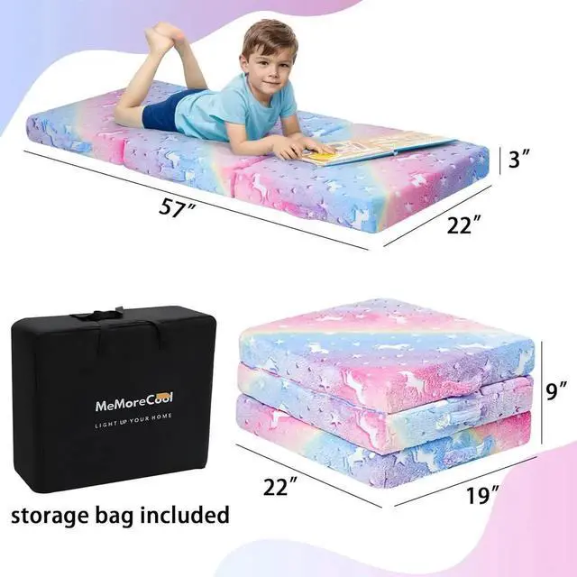 - [Glow in The Dark] The thin small mattress is made of glowing plush material, just expose the trifold kids mattress to bright light sources or sunlight for three hours, then take it to the dark room to see the glowing unicorn, add a warm and sweet charm to the kid's room