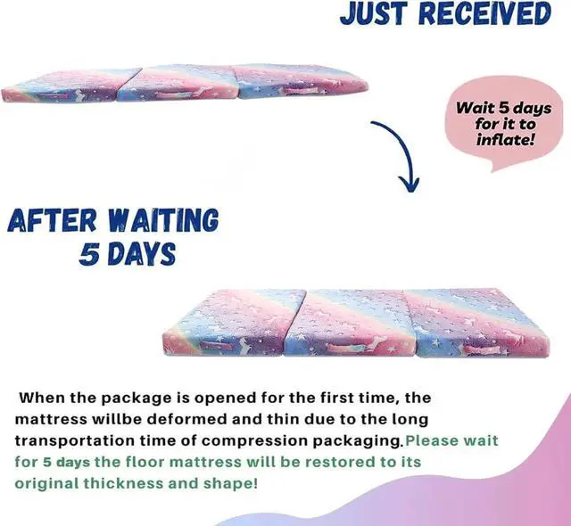 The floor sleeping mattress is easy to clean, and the fuzzy outer cover can be taken out for cleaningfalse- [Let It Inflate More Than 72 Hours] When the package is opened, the kids folding mattress will be deformed and thin due to compression packaging. Please wait for 3 days, then the toddler foldable mattress will be restored to its original thickness and shape! If you want to regain the thickness more quickly, please use a garment steamer, to bring the foam back to its actual height and remove wrinkles from the cover