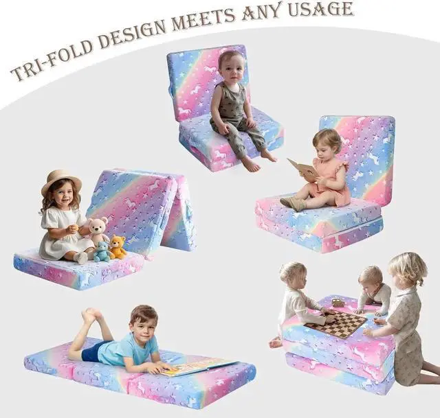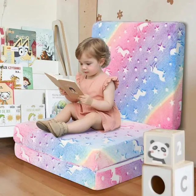 [3-in-1 Multifunctional] (1) Kids Foldable Mattress Floor Bed. The ideal trifold mattress pad for kids to take a break! This tri folding mattress can be used as a toddler floor nap mat at daycare, kindergarten, or home for daily use. (2) Floor Lounger Bed. One fold up mattress that can stand upright against the wall to provide back support, ideal for the reading nooks. (3) Foldable Futon Mattress. Three cushions are stacked to be used as children's pouf stoolsfalse[Glow in The Dark] The thin small mattress is made of glowing plush material, just expose the trifold kids mattress to bright light sources or sunlight for three hours, then take it to the dark room to see the glowing unicorn, add a warm and sweet charm to the kid's roomfalse[Convenient Handle, Liner Fabric, Machine Washable] Three handy handles are convenient to carry and move, so the kids can take the tri-folding mattress futon easily.