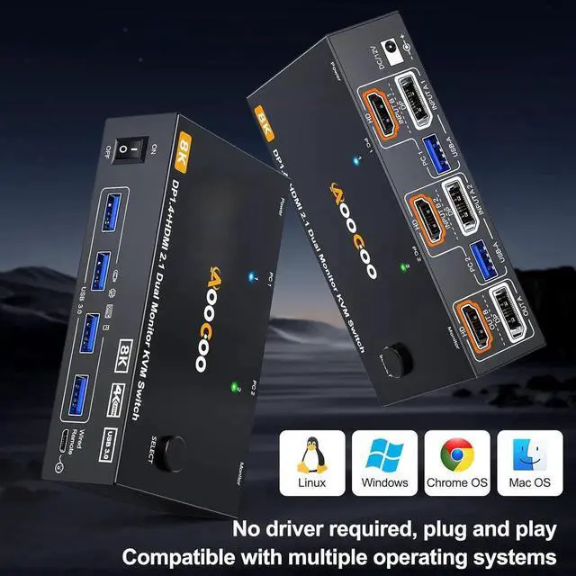 8K KVM switch 2 monitorsThe resolution and fresh rate of dual monitor KVM switch supports up to 8K@60Hz/4K@144Hz.