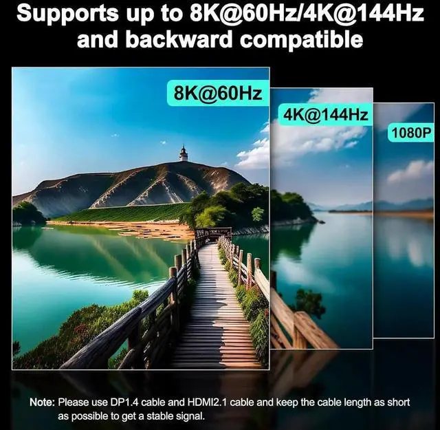 BUT PLEASE NOTE THAT: HDMI part supports 8K@60Hz4K@120Hz, and backward compatible. Displayport part support 8K@30Hz, 4K@144Hz and backward compatible.