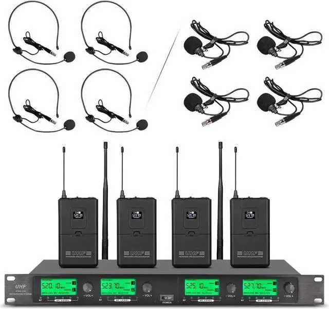 UHF 4 Channel Receiver with 4 Microphones 4 heasdsets 4 bobypack 4 lapel MicfalseIndividual volume controls on each Channel,Range Over 200 feet With Antennafalse4 XLR output , one 6.35/mm outputGood For Karaoke Church Speaking Conferencefalse