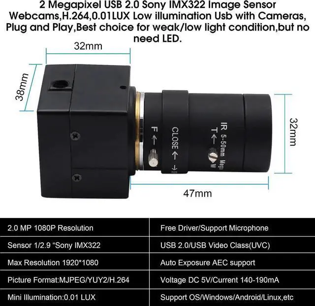 Function: Resolve color reduction and tone processing issuesfalse- 5-50mm varifocal Lens for all kinds of distance adjustable