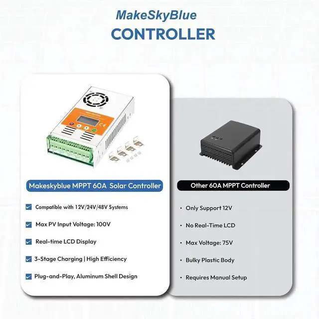 LCD displaysLCD displays cumulative power generation, error codes, temperature & voltage curvebacklight design for night checks. false[Intelligent Battery Protection]Guards against overcharging, overvoltage, and low voltage, safeguarding your battery's health. false- MPPT Maximum Power Point TrackingThe Advanced MPPT algorithm extracts up to 30% more solar energy than traditional PWM controllers, ensuring maximum efficiency even in cloudy or low-light conditions. Not obsolete PWM tech.