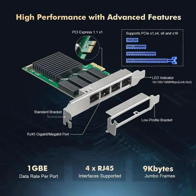 Network FeatureSupport PXE, Auto MDIX, IEEE 802.1Q VLAN, IEEE 802.3 bz( 2.5GBASE -T), Full Duplex flow control(IEEE 802.3 x), IEEE 802.1P Priority, Jumbo frame 16KbytesfalseEasy to UseSelect the appropriate brackets according to the chassis size, insert into the PCIe slots, install the driver, connect to the network, the LEDs show the link status and rate. Any questions, please contact our support email, we will provide timely service. false- Quads Port 2.5G bps The network card has 4 port 2.5 Gigabit with Realtek RTL8125B chip, compatibe 1Gbps/100M/10M auto-negotiation, support standard Cat5e or above UTP at distances up to 100m (328 feet)