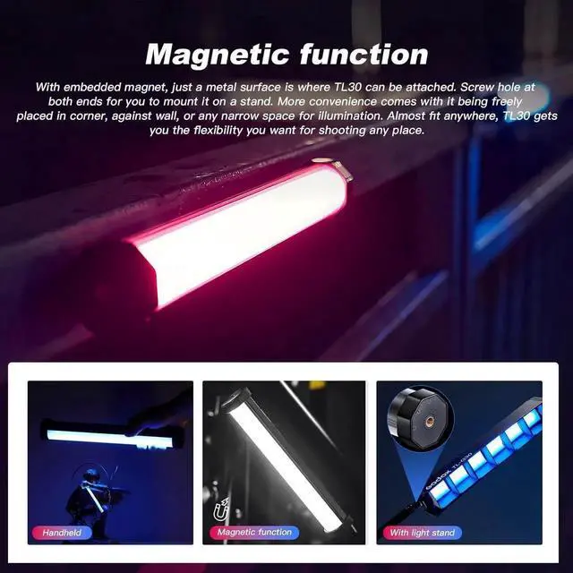 Magnetic RGB Video Light With embedded magnet, just a metal surface is where TL30 can be attached. Screw hole at both ends for you to mount it on a stand. More convenience comes with it being freely placed in corner, against wall, or any narrow space for illnation. Almost fit anywhere, TL30 gets you the flexibility you want for shooting any place.