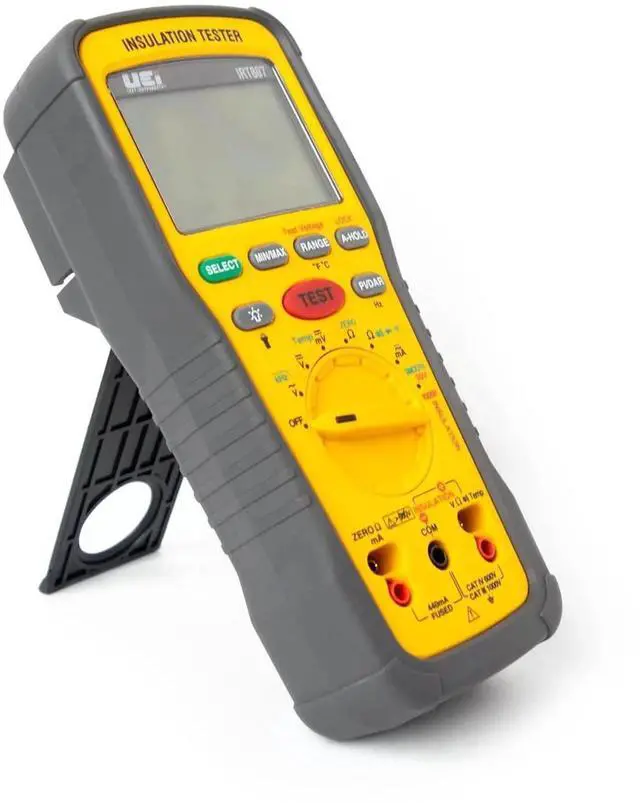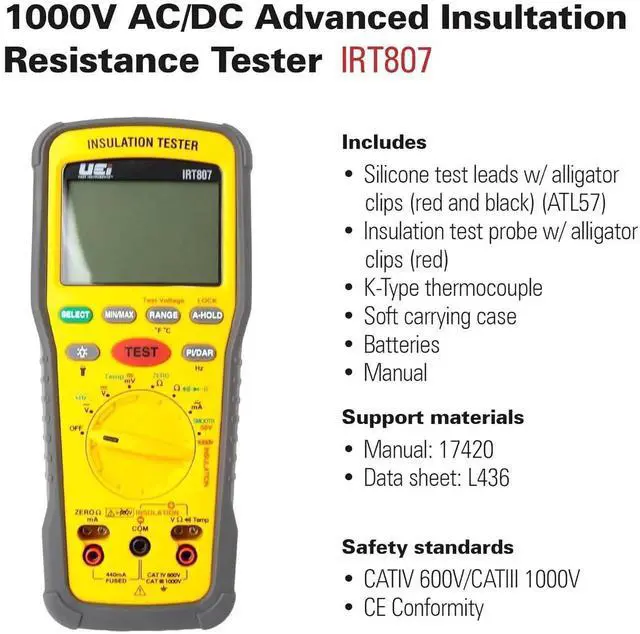 The IRT807 is a professional level insulation resistance tester with 1000V and 40M ohms ranges, continuity, Pi/DAR test, compare and Lock features, a rotary style selector switch, protective rubber boot with a kick-stand and is backed by a 1-year limited warranty.