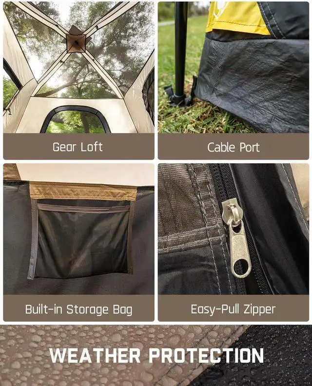 Windproof & Waterproof: The cabin tent's stable foundation comes from a removable canopy, strong camping pegs, and adjustable camping ropes that keep it firm even in the face of strong wind gusts. Made of high-quality waterproof fabric, a rain leak to the lower part of the tent door zipper can prevent leakage and accumulation. The camping tent's interior space remains dry at all times, even in harsh environments