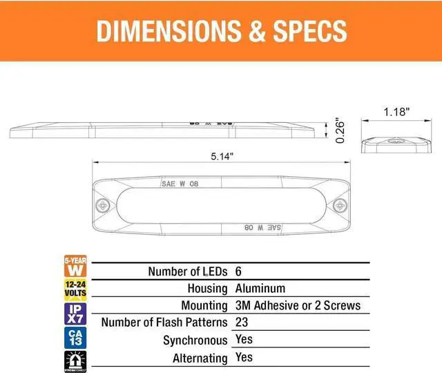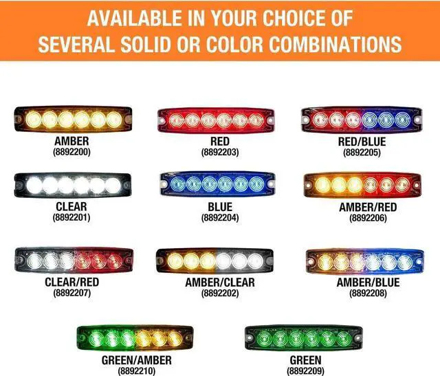 Buyers Products 5 Inch Surface Mount Ultra-Thin LED Strobe Light is designed with an ultra-slim. 26 in. profile to fit tight areas. The 12-24V strobe light features 23 flash patterns with alternating and synchronous features. It's available in your choice of several solid or color combinations. Solid colors have a SAE J595 Class 1 rating and are CA13 certified. All lights are IPX8 waterproof rated. Lights include 3M self-adhesive tape for simple fastening. An optional 90° mounting bracket is sold separately for a more permanent installation. Lights are backed with a 5 year warranty.