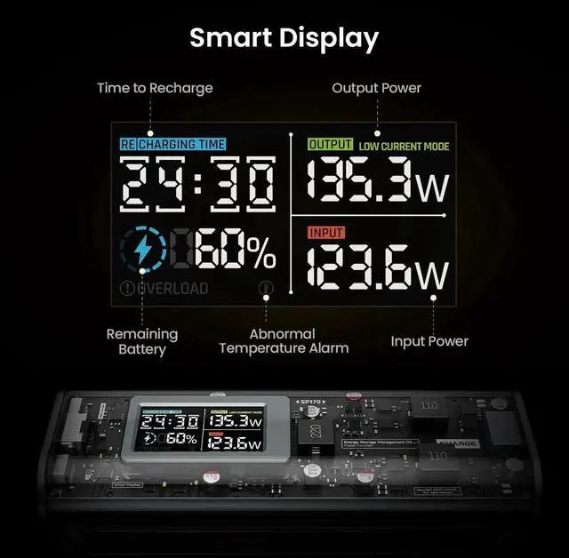 - Smart Display: Transparent design with a display showing charging power, time, and battery level. Monitor status anytime, anywhere