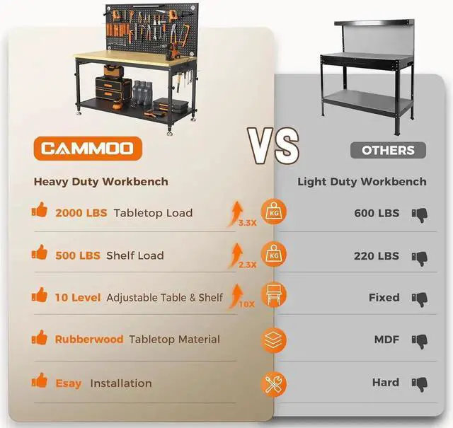 This feature allows you to customize the work table height to your preference, whether you prefer to stand or sit. Our workbenches ensure a comfortable working environment. Meanwhile, adjustable metal feet adapt to uneven ground to maintain stability- [Save time] Pre-installed and structures without driling save your installation time easily. Detailed instructions come with the package. We also provide a detailed assembly video on this page. Customize your workbenches for garage, office, home, commercial, and Woodworking Shop.