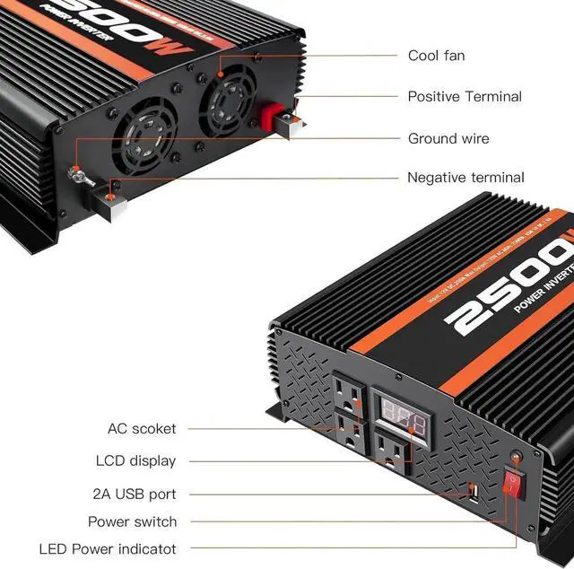 {Intelligent fan cooling} The 2500W modified wave inverter uses an intelligent fan system to dissipate heat during the entire operation. When the internal temperature of the machine reaches a certain level, the fan rotates to effectively reduce the temperature.